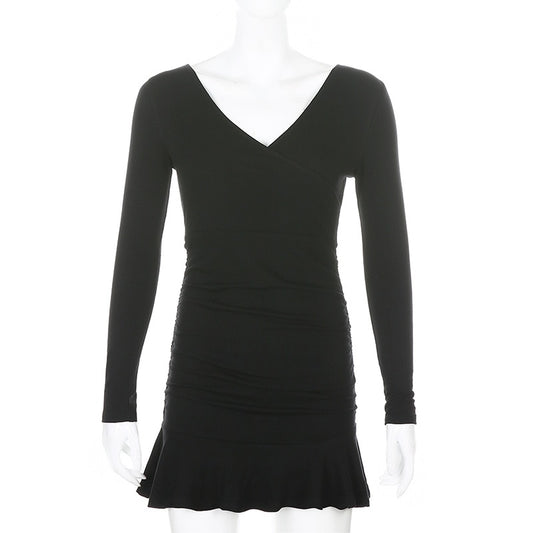 "Kitty Kat Bodycon" Black Knitted Ribbed Midi V Neck Elegant Long Sleeve Ruffles Bodycon Dress